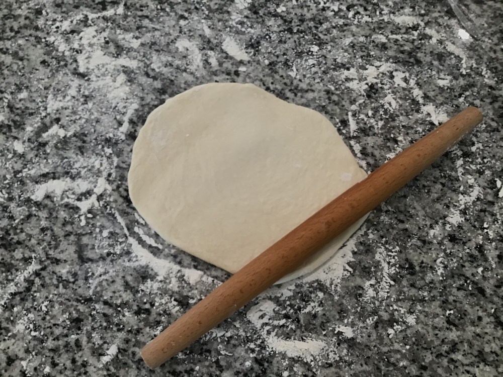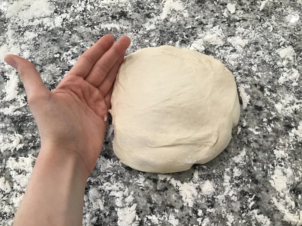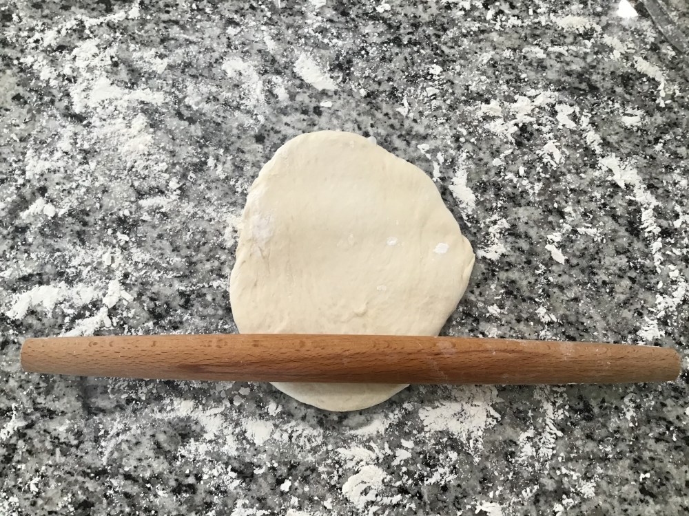 Now this is where the practice comes in. Take one of your dough halves, place it in the middle of your floured surface, and gently shape it into a bit of a circle.