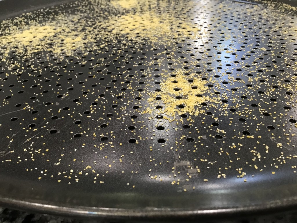 Also, I highly recommend sprinkling cornmeal on your pan before laying the dough on. It really helps prevent sticking.