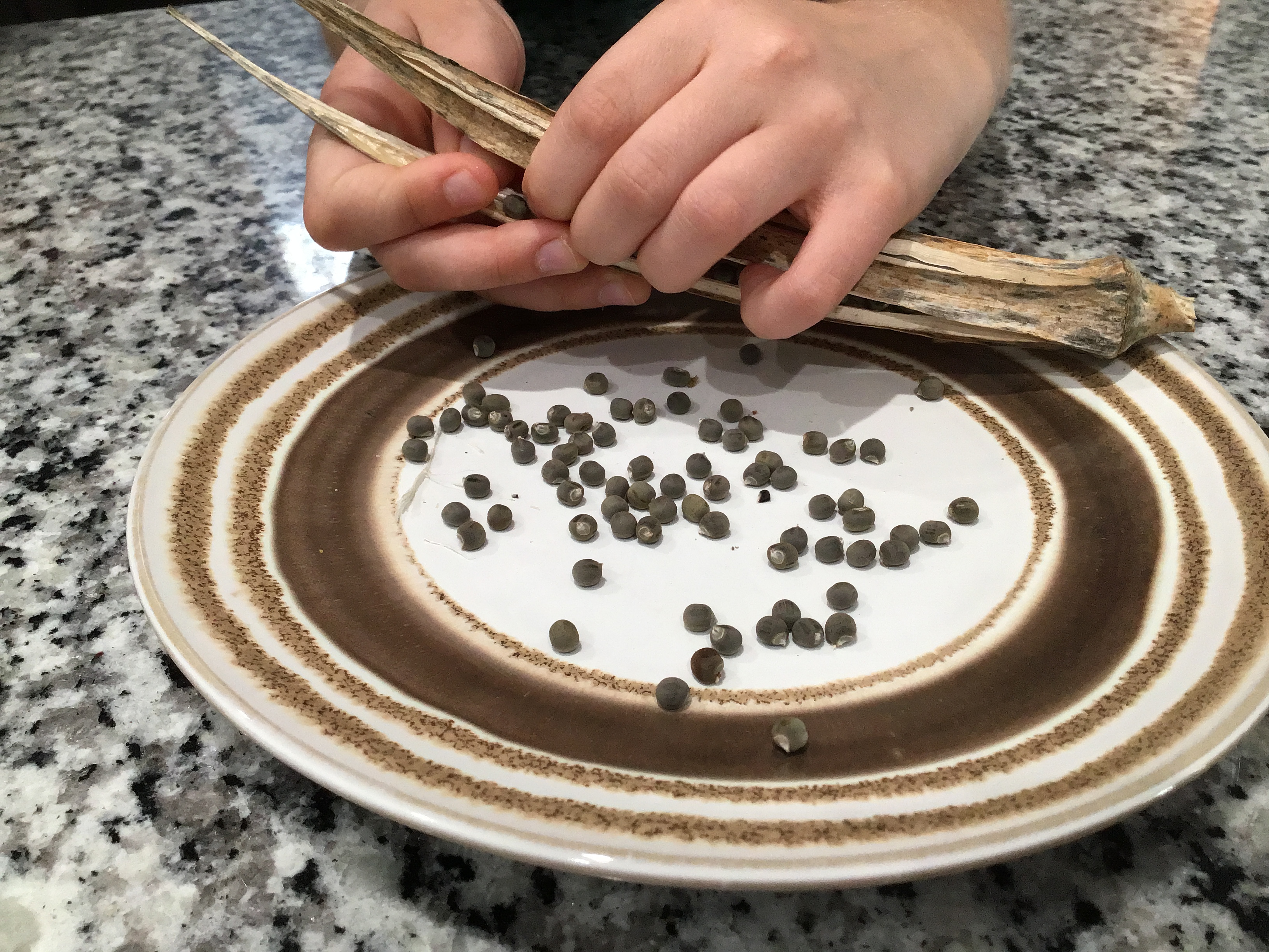 Once your pod is ready, cut it off the plant and break it open over a plate to let the seeds fall out.