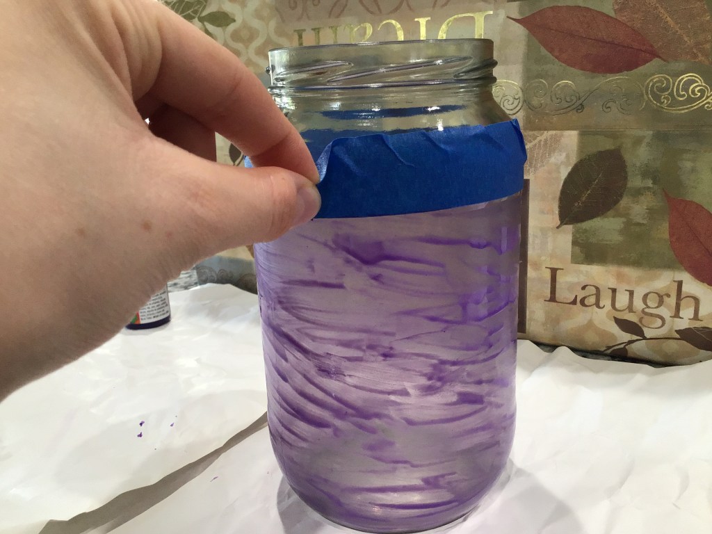 Since purple was the color I had the most of, I decided to use it to paint the bottom portion. By the time I finished, I could see that this project was definitely going to need more than one coat of paint; but…