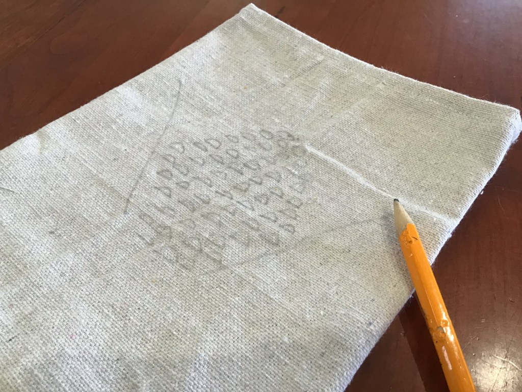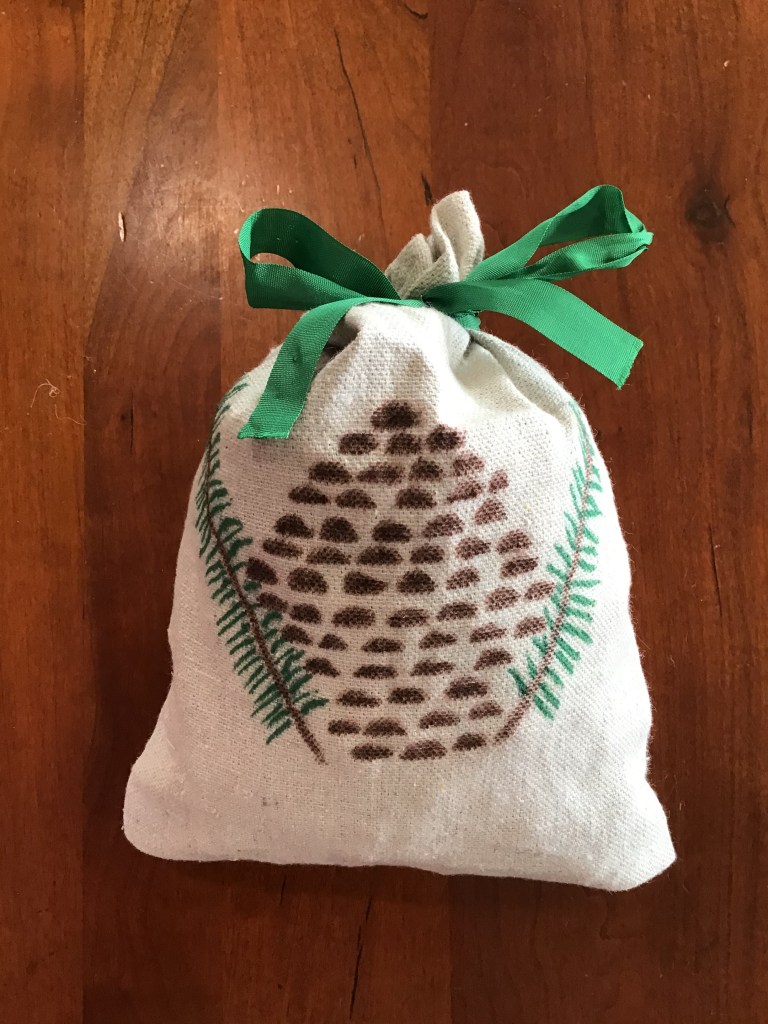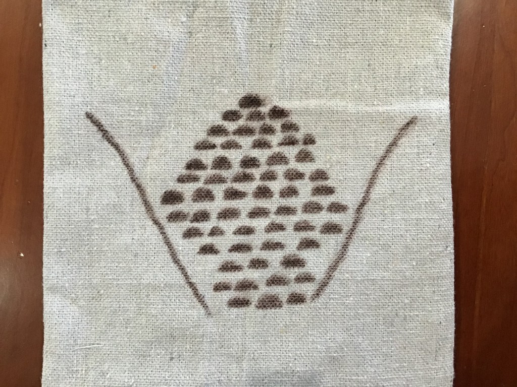 Now it’s time for the best part–the decorating! Grab your pencil and sketch a pinecone on the front of your bag. I’ve found the easiest way to do this is to draw little ovals, starting with one at the top, and making each layer have progressively more circles until I think it’s big enough, and then decreasing the circles till I get to the bottom. You’ll also want to add a wispy stick on each side of the pinecone–these will serve as centers for the bunches of pine needles.