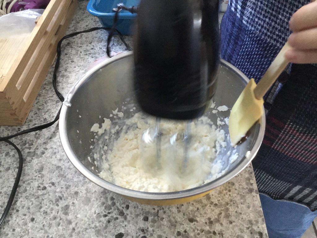 While your crust is baking, dump your softened cream cheese and 3 TBSP of milk into a bowl and cream it very well. Try to leave as few lumps as possible; but don’t stress it. π