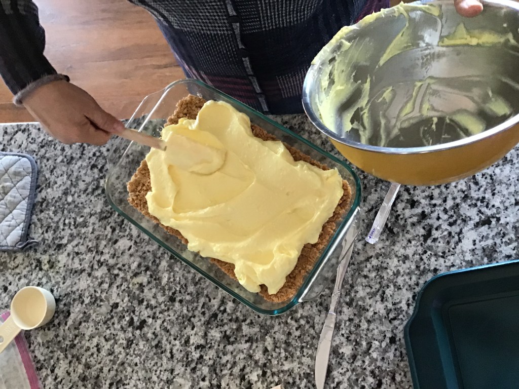 Pour the mixture onto your cooled crust, and spread it evenly. You can sprinkle more crushed crackers on if you want to as well. Then refrigerate your finished piece for about 4 hr…