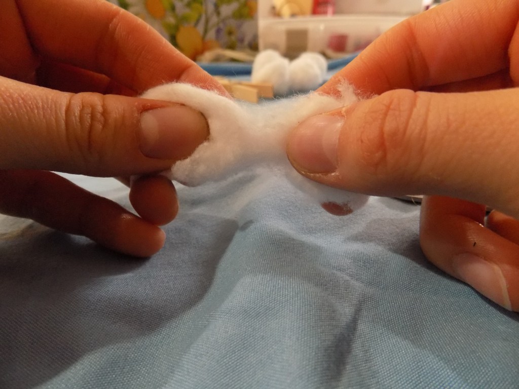 Then, tear your cotton balls in half, and roll the halves in your hands to give them a rounded shape.