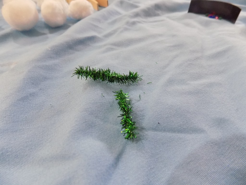 Cut a length of pipe cleaner or ribbon long enough to go around the snowman’s neck, and another slightly shorter piece…