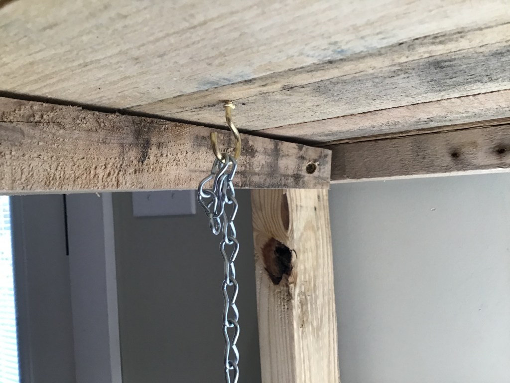 As you can see above, we used cup hooks screwed into the “ceiling” of the shelves to hang the lights from.
