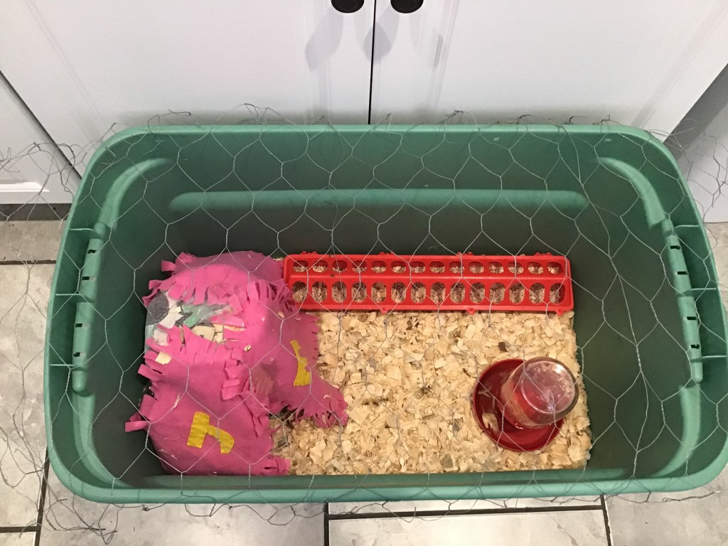 I covered the top with a piece of chicken wire to keep our fluffy canine friend out…as well as unsupervised little children. A cover will also be useful if your chick’s home is shallow, as it will prevent them from jumping out.