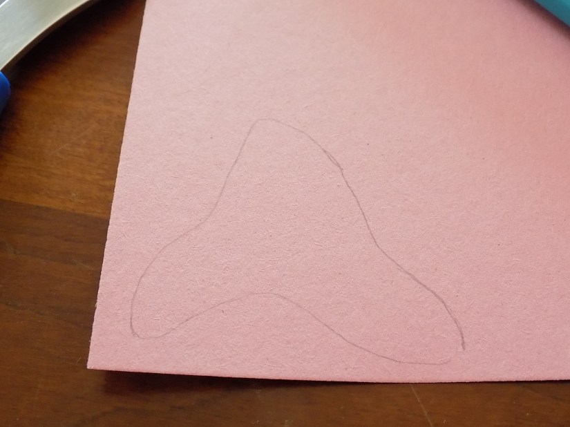 Boy this rose lemonade tea is good… OK, let’s get going! Start by drawing a blobby sort of triangular shape on your pink paper. It doesn’t have to look exactly like mine–you’re just drawing petals basically.