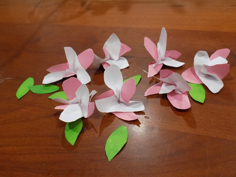 Continue until you have a whole bouquet of blossoms; then follow up with some leaves! I just cut some out of white paper and colored them in with a Sharpie, but obviously if you had green paper it would be a lot simpler to just cut them out of that. πŸ˜‰