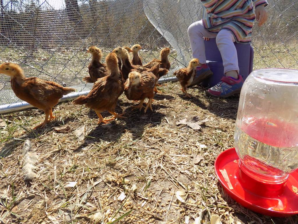 I will note here, I did wait to move the babies out until the lows overnight were above freezing. I didn’t feel like they had enough feathers on their head to take that kind of cold…but I could be wrong. After all, I am just a spring chicken when it comes to chickens, LOL! π