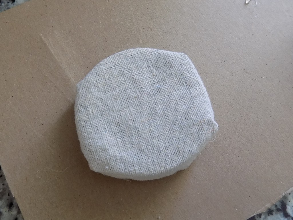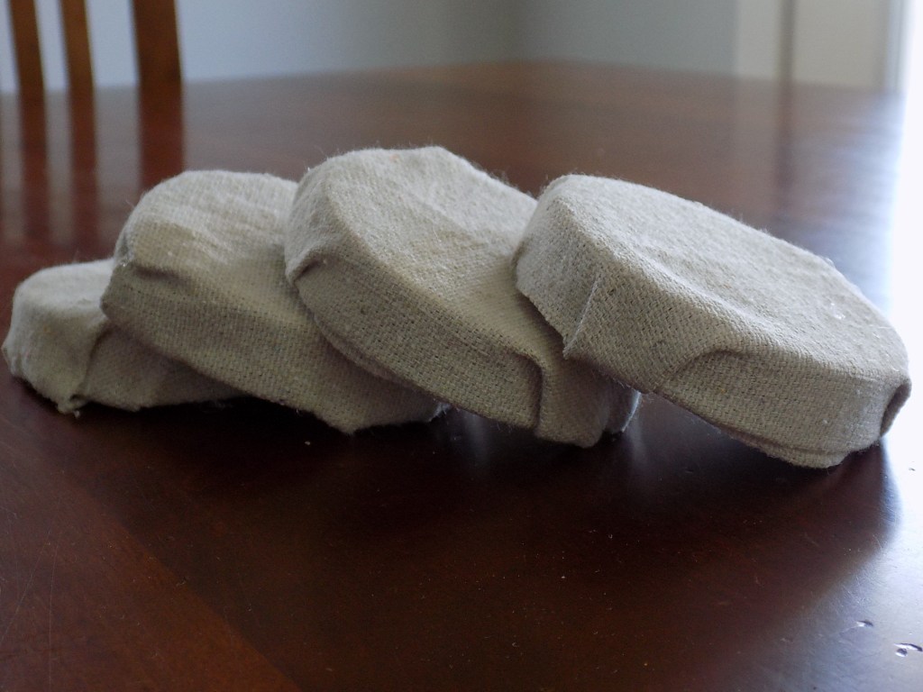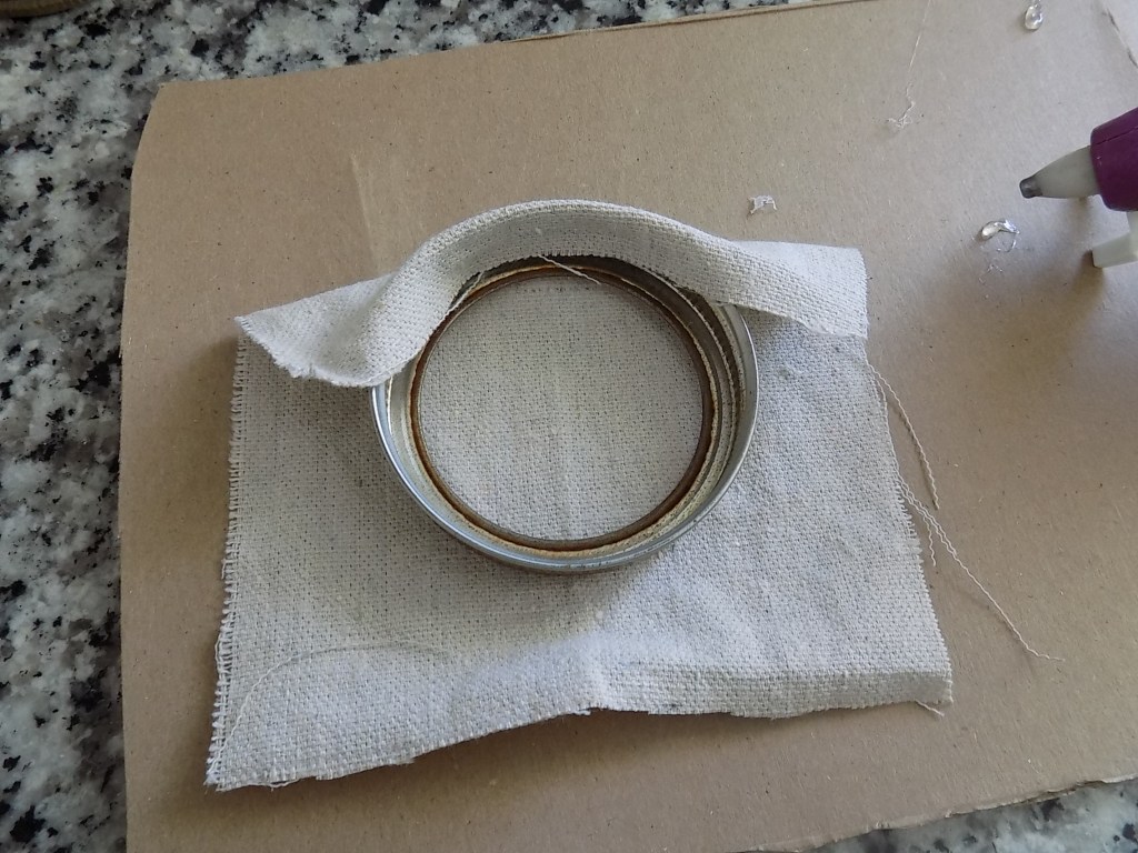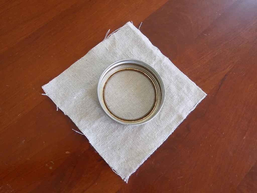 Measure and cut out squares of fabric that are about 3/4 in. bigger around than your lid.