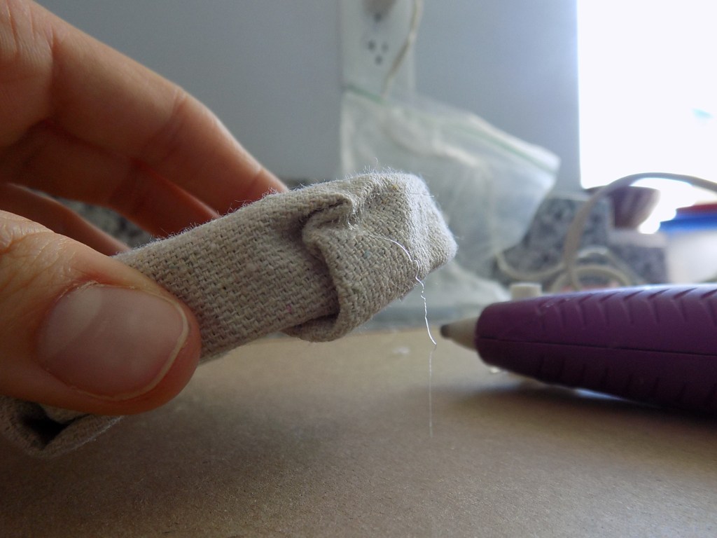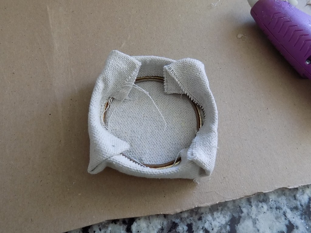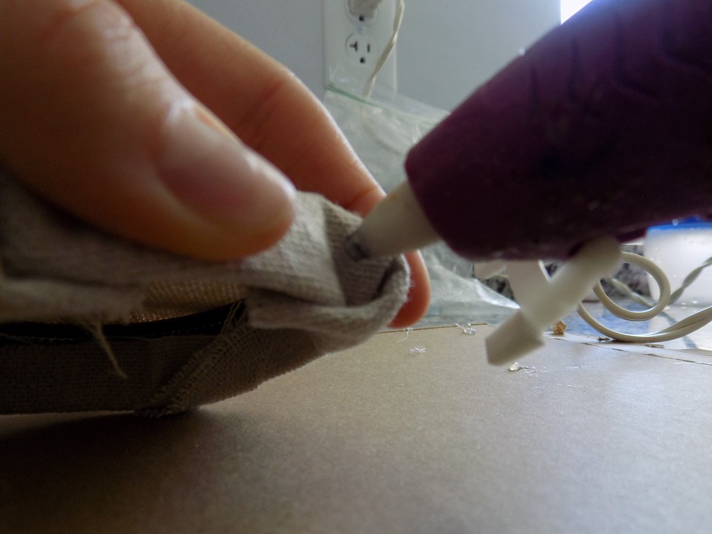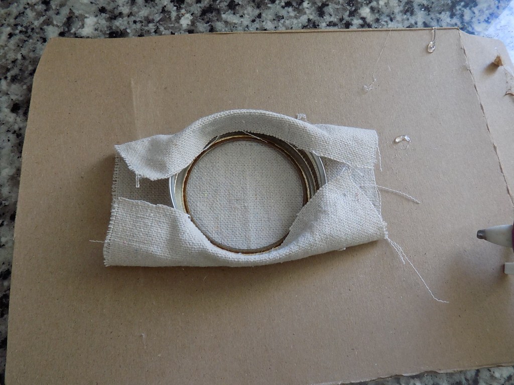 Next, fire up that glue gun and glue down one side of your fabric as shown in the picture above. I will note though, DO NOT APPLY THE GLUE TO THE METAL RING! I did that and I started hearing weird electrical popping sounds–not good. :0 Put the glue on the cloth itself instead. And watch your fingers–I burned mine several times while making these, LOL! Craft at your own risk… πŸ˜‰