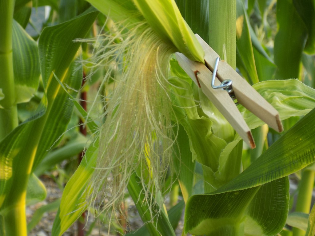When the silk begins appearing on your corn, take a clothespin and clamp it where the silk first begins. The earworm moths lay their eggs on the silk, so the pin will help prevent them from climbing up the silk and into the ear once they hatch.